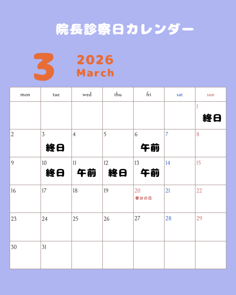 ※日程が急遽変更する可能性があります。院長のみの診察をご希望の場合、念のため事前にお電話にてお問い合わせください